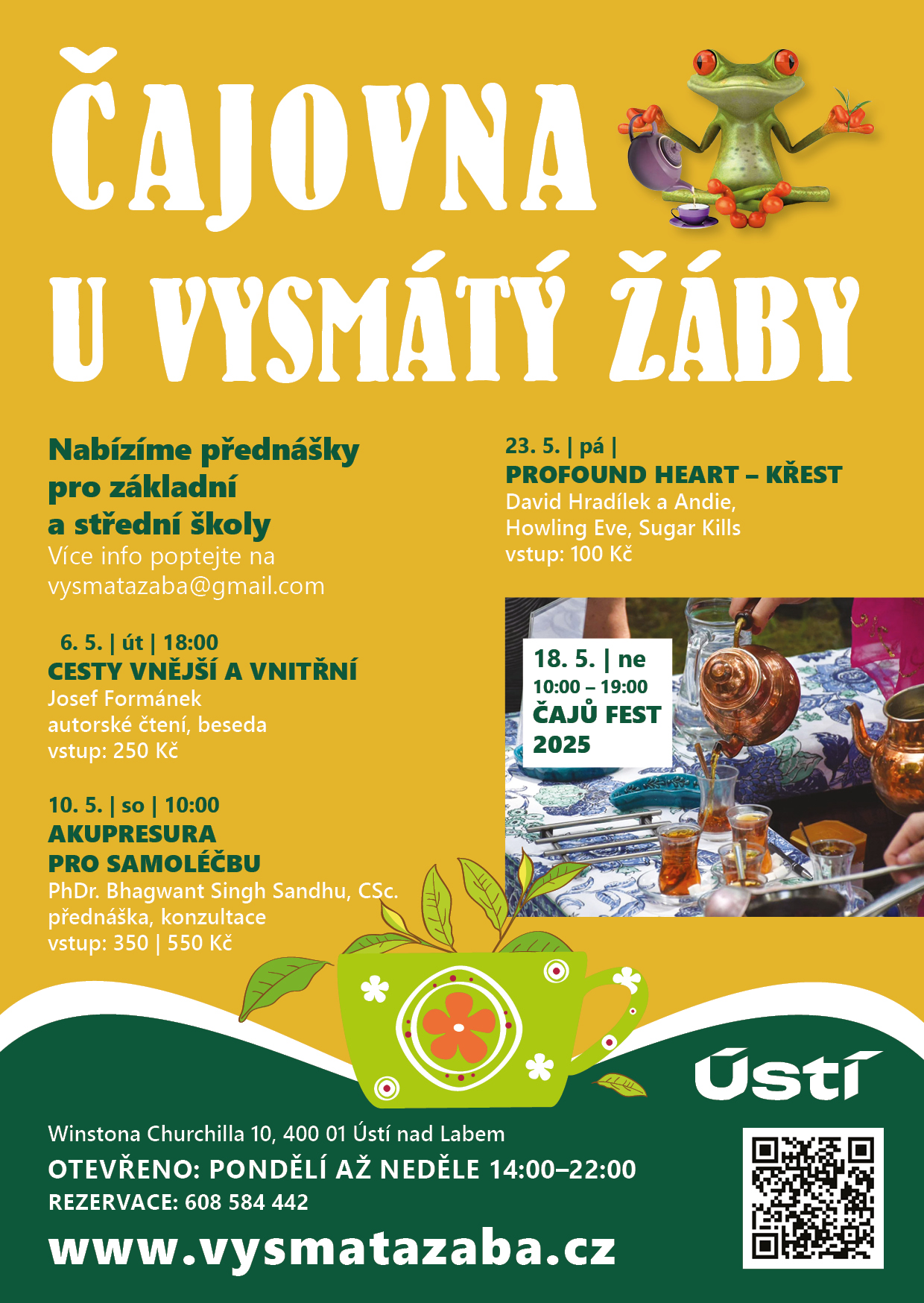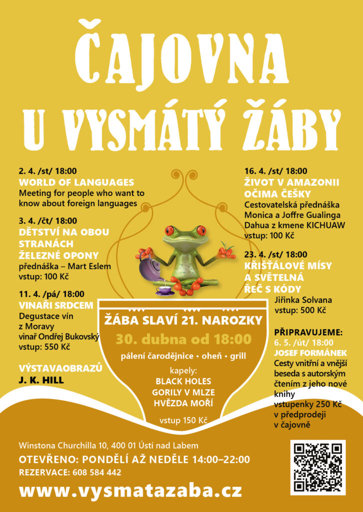 Program na měsíc květen v čajovně U vysmátý žáby se nám trochu změnil. V sobotu 10.5. od 10 hodin bude workshop „Tělové svíce v praxi“ a na 24.5. sobotu od 10 hodin se přesouvá „Akupresura pro samoléčbu“ s panem PhDr. Bhagwant Singh Sandhu, CSc. Na obě tyto akce si rezervujte místo na: poradenstviusti@gmail.com. Těšíme se na vás.